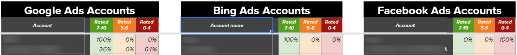 If we look at the screenshot above, we can say for example that 64% of my total budget on Google for the second account has been spent on “underperforming ads” (ads that are marked as “below average”). This will allow us to narrow down the issue for this specific account later on.