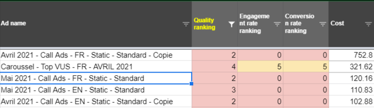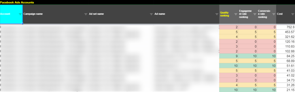 The colored columns (numbered 0-10) next to the “quality score”column (also numbered 0-10) are there to tell you why the quality score is bad. Facebook, for example, gives us information about the “engagement score” as well as the “conversion score”. This information gives a good hint on why the score is low and indicates what should be corrected moving forward.
