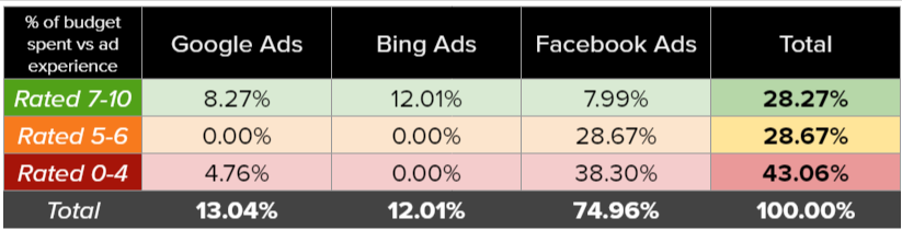 Same as on the “by platform” and the “by account” tab, we calculate the cost of all the ads within the date range (default: last 30 days) that had at least 1 impression, ordered by COST DESC. Each ad impression that has a quality score of 10-7 can be considered “good”, 6-5 can be considered “average” and 0-4 can be considered “poor”.