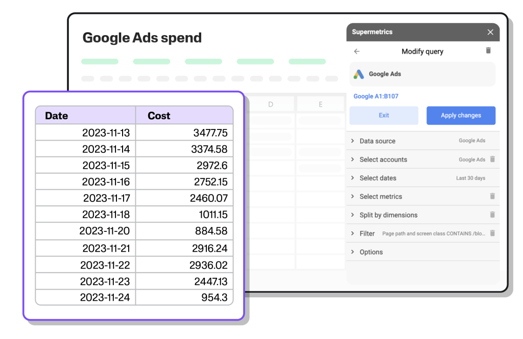 Ideally, a budget pacing tool would always be up-to-date and require minimal management work. That’s where Supermetrics and Google Sheets come in handy.