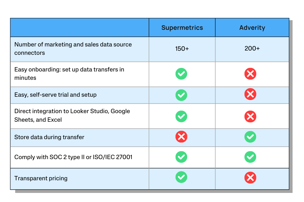 When deciding on a marketing data integration platform, it’s crucial to understand how each solution aligns with your business needs. Supermetrics and Adverity are two popular options. Both offer robust data management and analytics capabilities but with different approaches. In this blog, we’ll provide a detailed comparison to help you make the right choice. The criteria include:
