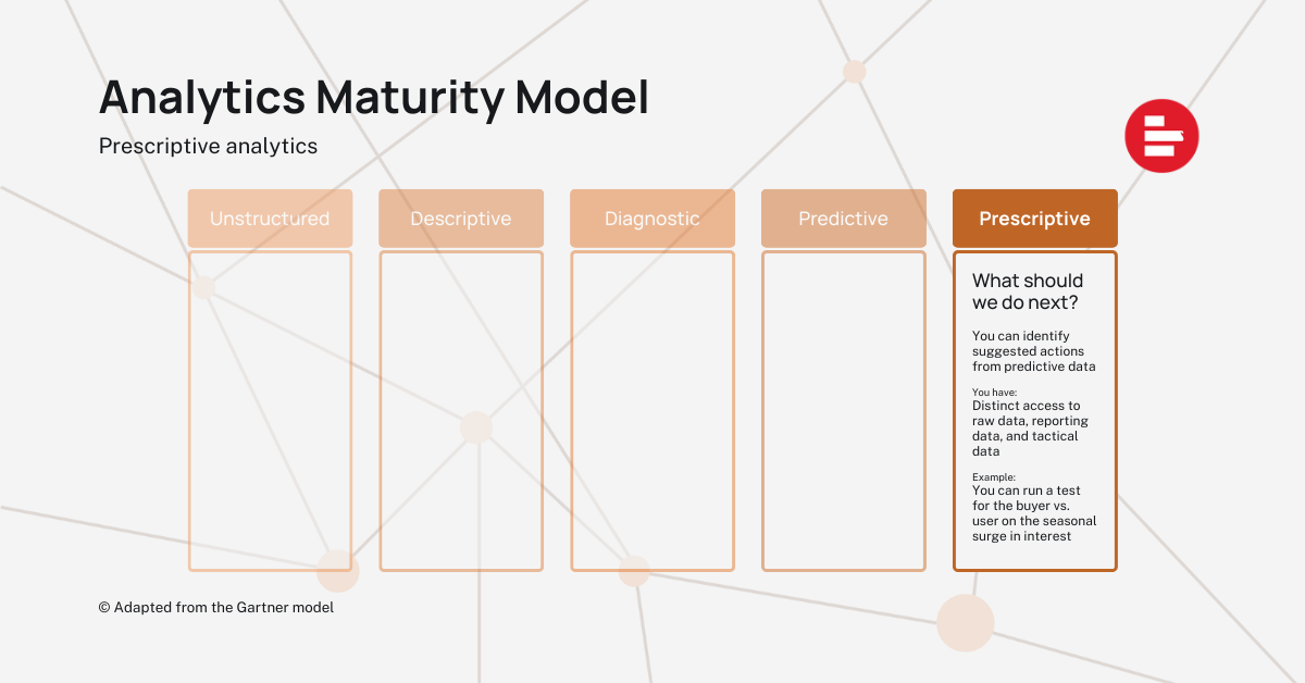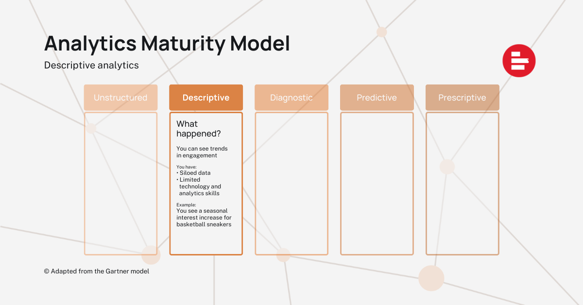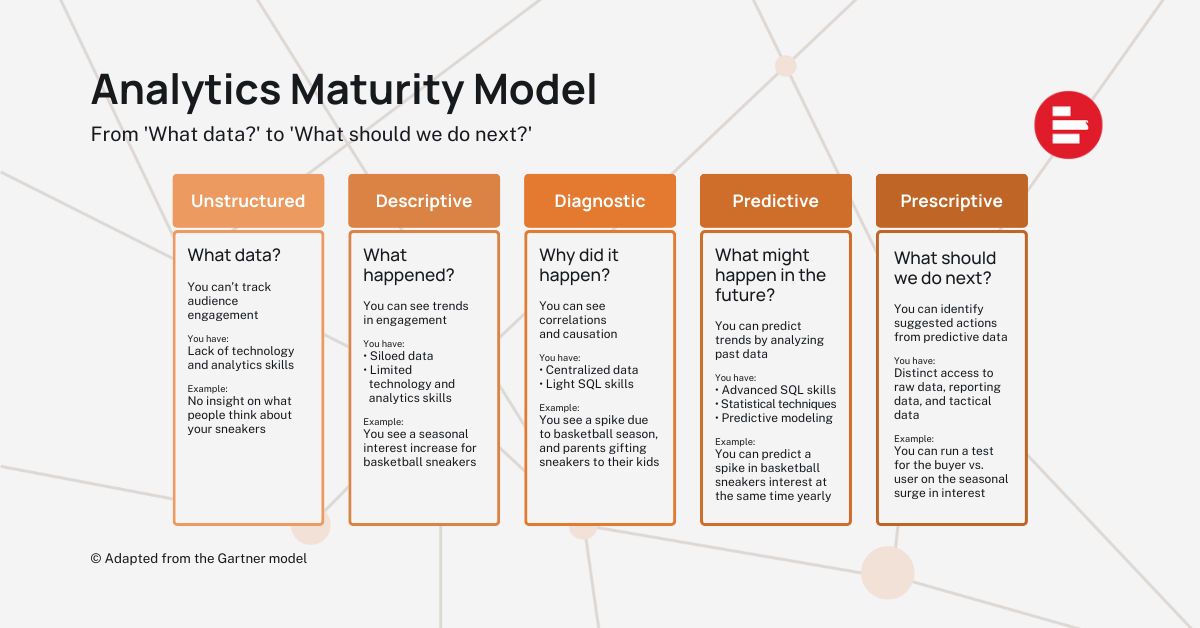 We’ll use the Gartner model as a baseline. We chose their model because it’s easy to understand, actionable and applicable across segments outside of marketing—like sales, finance, etc. Also, since many analytics maturity models are quite similar, so you can apply the steps, actions, and recommendations in this post, regardless of the model you’re using.