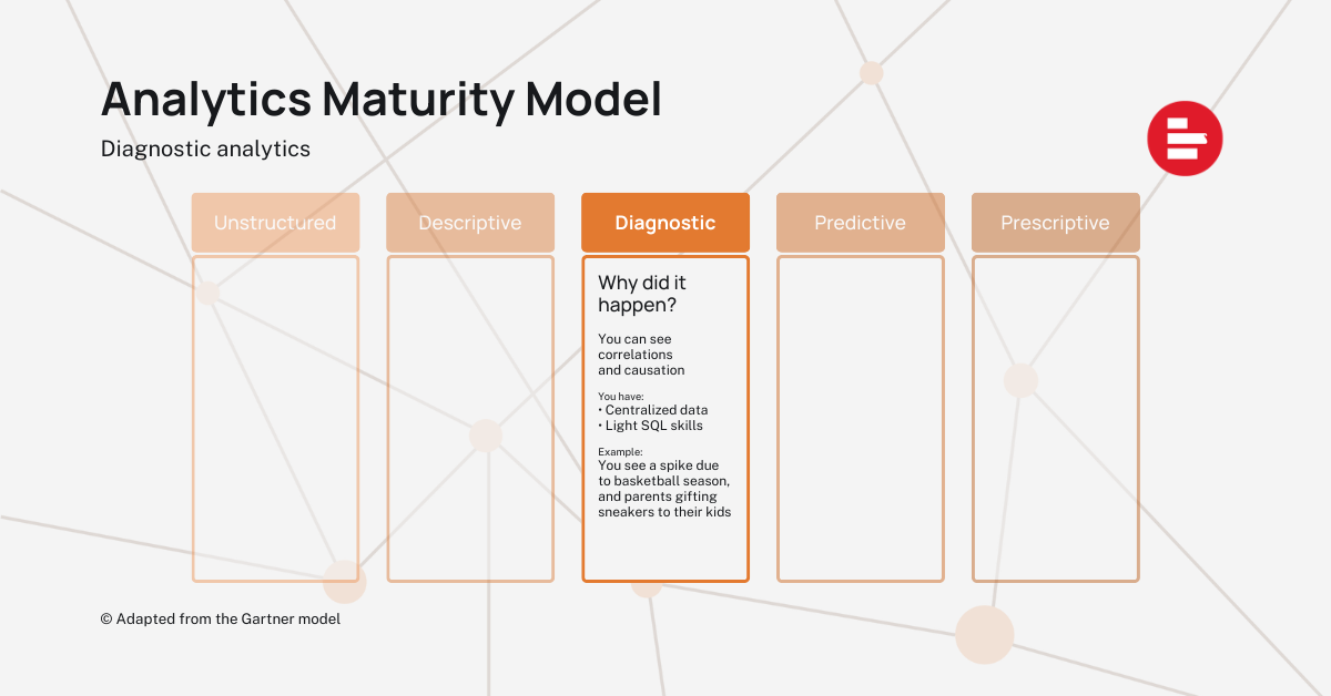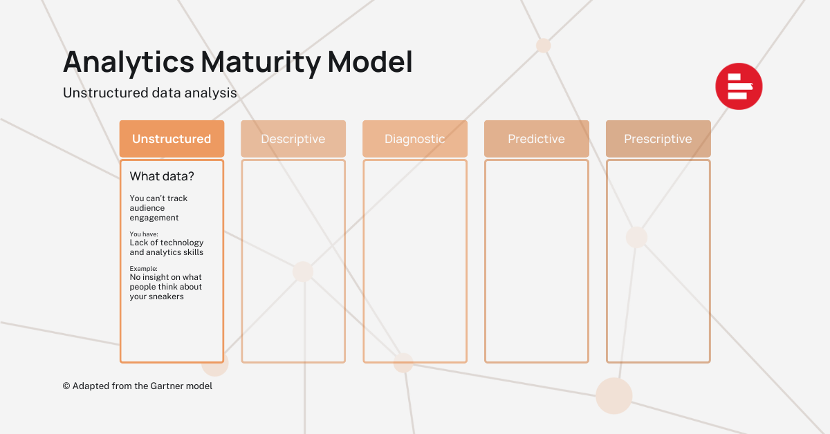 The Gartner model has four stages, with the first stage requiring some basic analytics skills. We added one more stage to the model—unstructured—to cover businesses that don’t have any analytics skills. Then you have descriptive, diagnostic, predictive, and prescriptive analytics. We’ll go through each one separately and help you understand your phase and how to move forward.