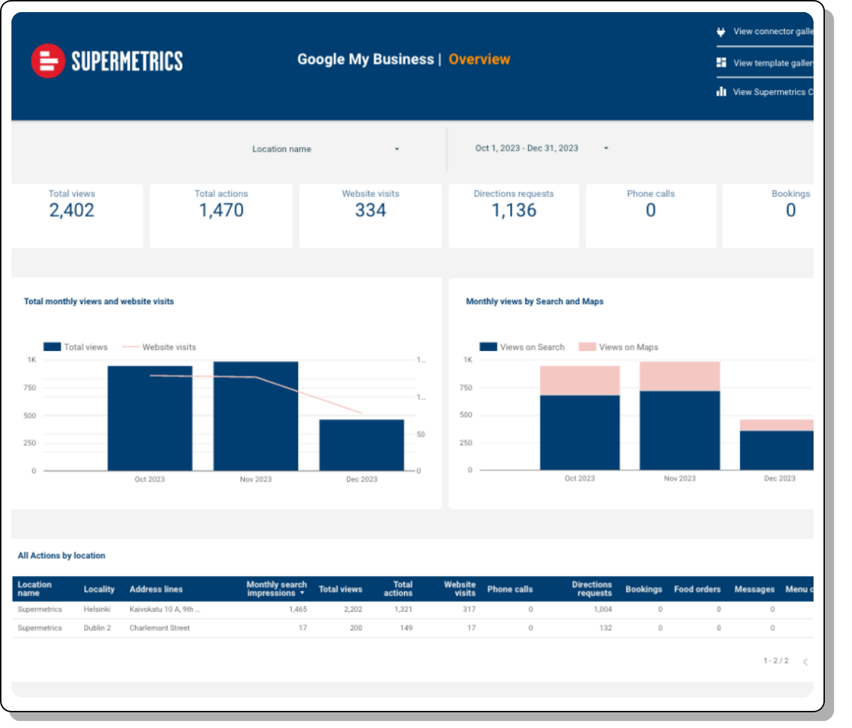 You can use this template to stay on top of your Google My Business listing’s visibility, engagement, and reputation. It’ll help you answer the following questions: