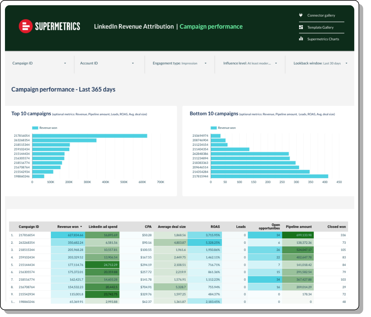 You can use this 3-page template to see how your LinkedIn ad campaigns influenced closed won deals and business revenue. It’ll help you answer questions such as: