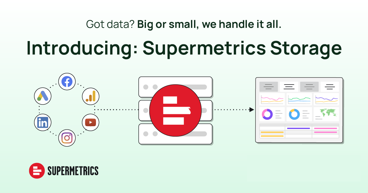That’s why we’re adding Supermetrics Storage to the Marketing Intelligence Cloud . It’s a secure and easy-to-use solution that gives you the same benefits you’d get from a data warehouse without the technical requirements. You can start building your data repository and experiments with more complex reports without worrying about slow loading time.Supermetrics Storage is opt-in by design, so you can choose which data you want to store. Note that Supermetrics Storage is available as part of the Marketing Intelligence Cloud.
