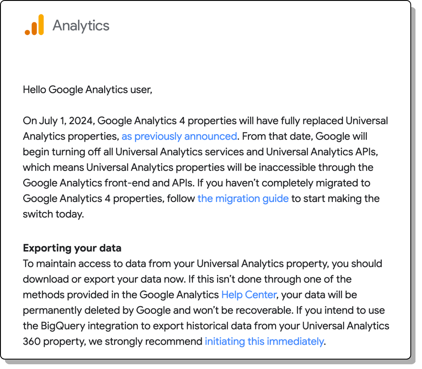 Let’s address the elephant in the room. If you’re using Google Analytics, you probably received this reminder from Google.