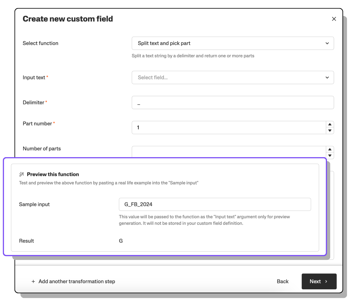 Splitting your text field, such as the campaign name, into multiple parts using the Split text pick part -function is one of the most popular use cases for Supermetrics Custom Fields. To make this even more accessible, we’ve added a preview window to see which part of your text field the function returns before you even create the field.