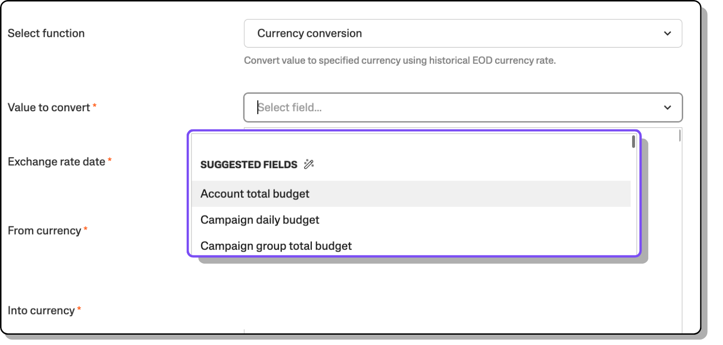 Suggested fields help you find the most suitable fields based on your selected function. You won’t have to search through a long list of metrics and dimensions. For example, if you want to convert your currency, you’ll immediately see a list of different types of budgets you can add to your report.