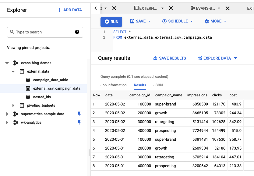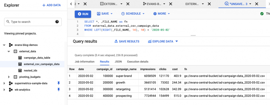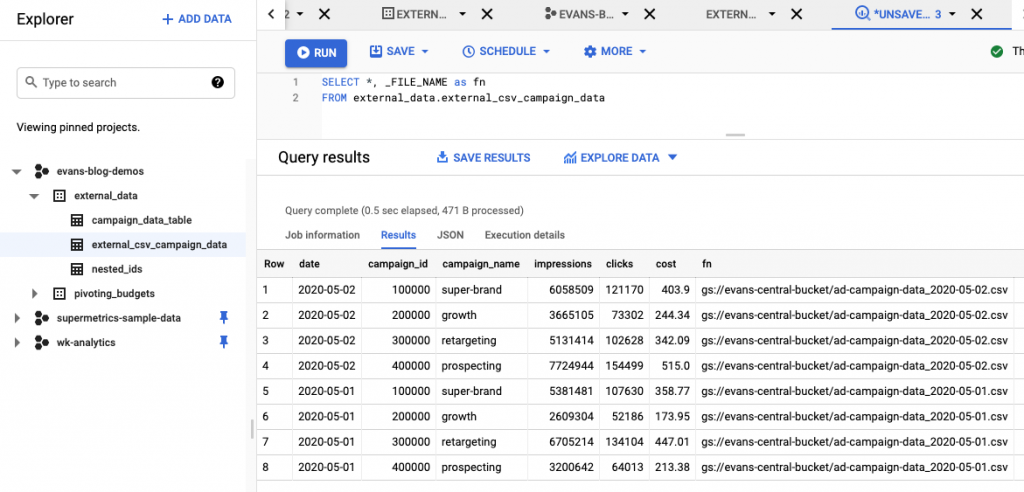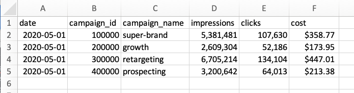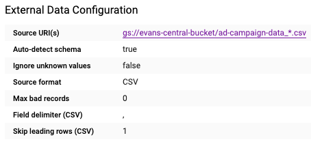 - Select file from GCS bucket: evans-central-bucket/ad-campaign-data_2020-05-01.csv