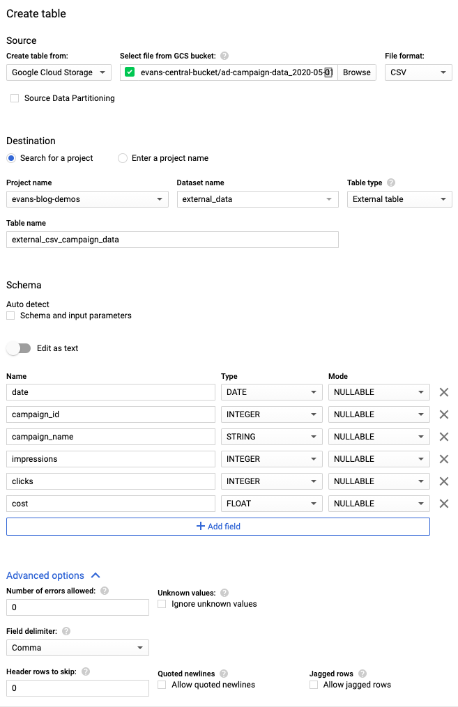 - Create table from: Google Cloud Storage