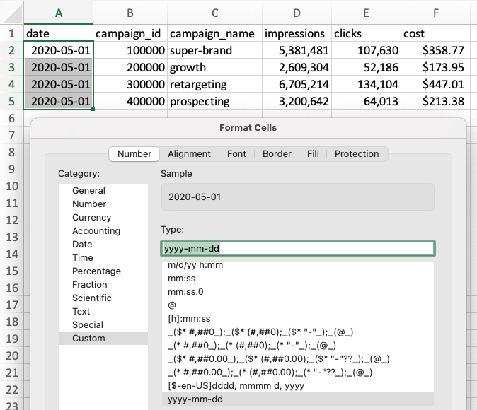 The only trick to watch out for here is making sure your date columns are formatted correctly. You can make sure that they are saved correctly by applying custom formatting to the cells that have dates in them.