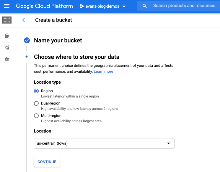 For customers in the US, you’ll need to roll with us-central1 as your region, as we’ll be using what are called “External Tables” in BigQuery. European customers will need to create a bucket in europe-west1. At the time of writing, these are the only bucket locations that support external tables. Here’s a guide that will be updated when this changes .