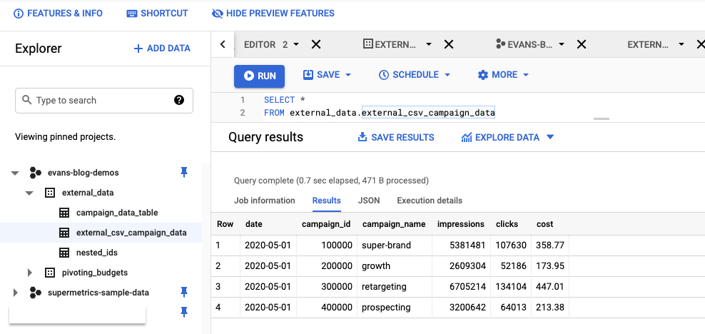 You’ll now be able to query your data in Google Cloud Storage exactly the same as if it were a native table in BigQuery.