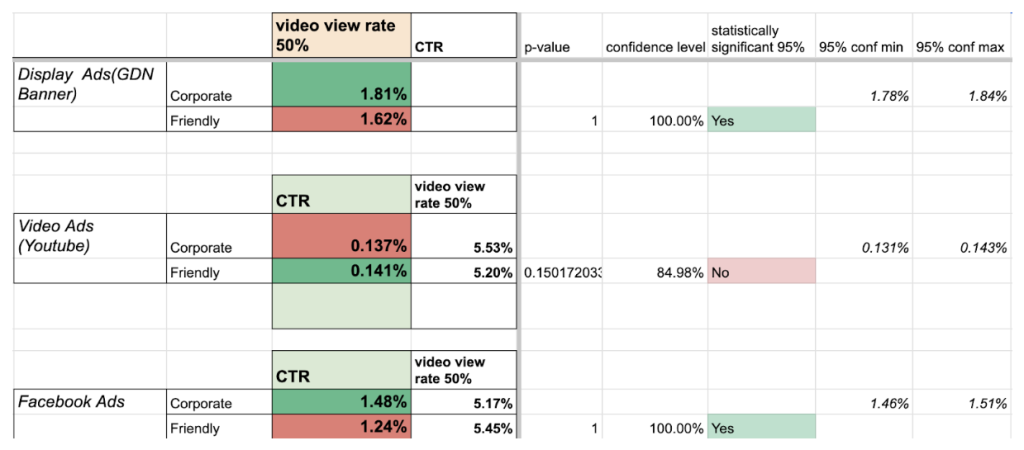 To keep track of all the campaigns across the ad platforms and to aggregate the results, we built an automated report in Google Sheets using Supermetrics that kept the test data up to date. This spreadsheet helped monitor the test campaigns and gave us a unified view. Once the test had ended, we used the report to determine the winner and calculate whether the difference in campaign results was statistically significant.