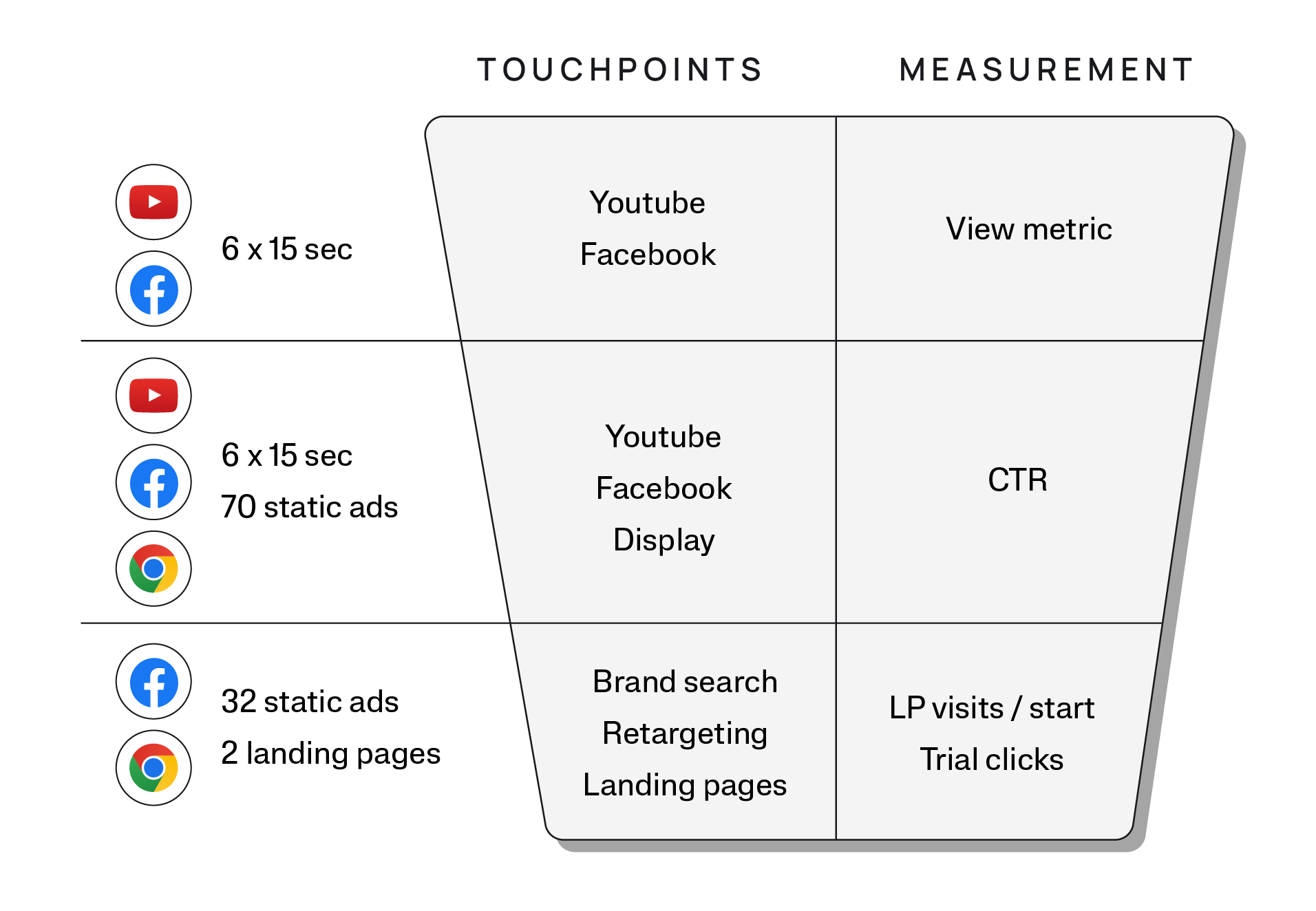 - Middle: 70 static ads on Facebook (KPI: CTR)