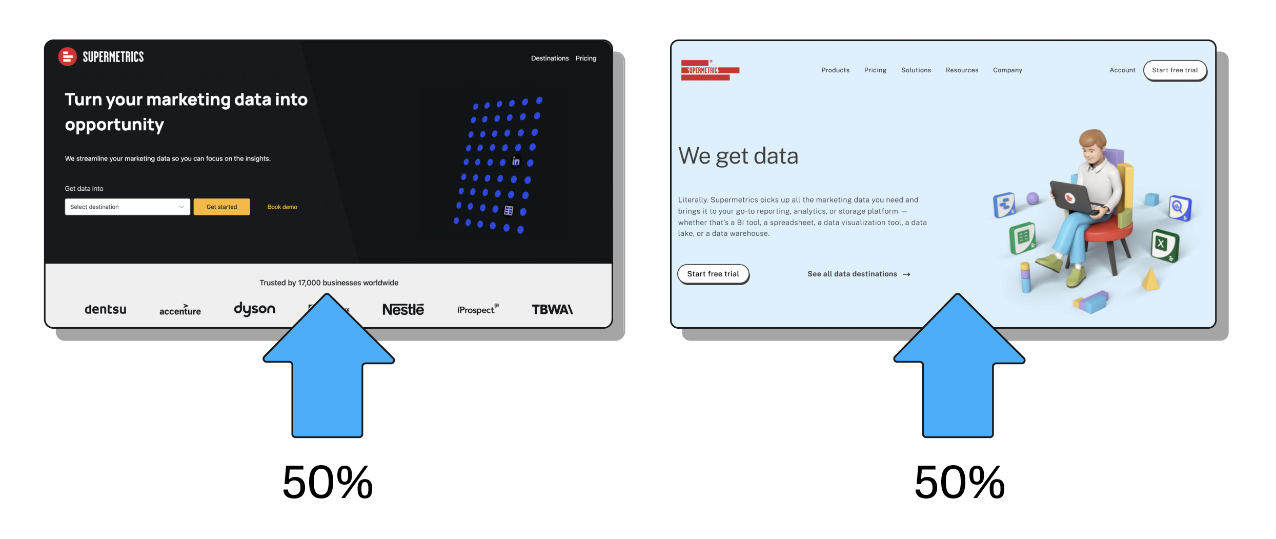 So, at Supermetrics, we decided to take a different approach to renewing our brand and measuring its impact. We devised a full-funnel brand experiment comprising nine tests across the funnel to let data decide which direction to go.
