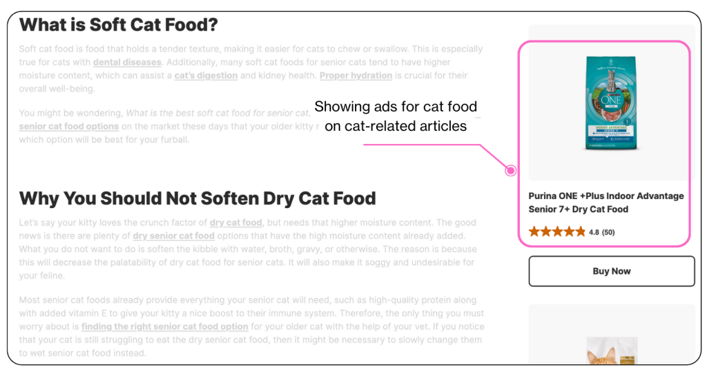 At its core, contextual advertising is super simple: it involves placing ads on web pages where the content aligns with your product. It’s a cookieless tracking solution that targets ads based on the content of the page itself.
