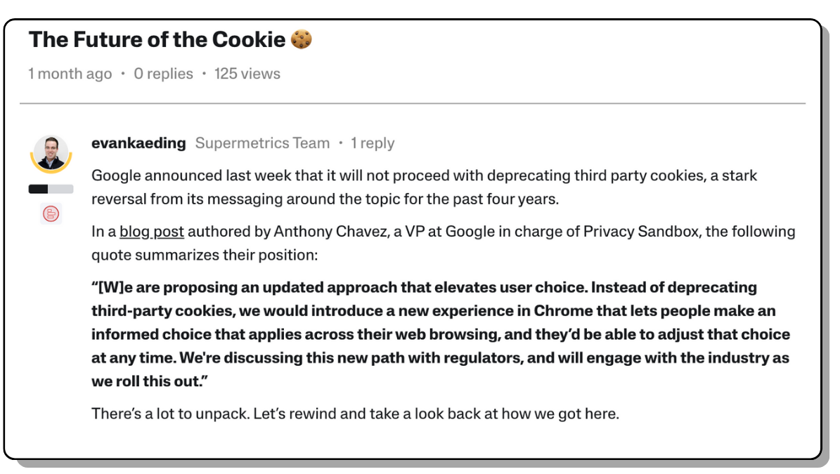 My colleague Evan Kaeding also shares his view on the future of cookies and Google’s decision in the Supermetrics community , which is a great place to be if you want to catch up with the latest industry news and Supermetrics tips.