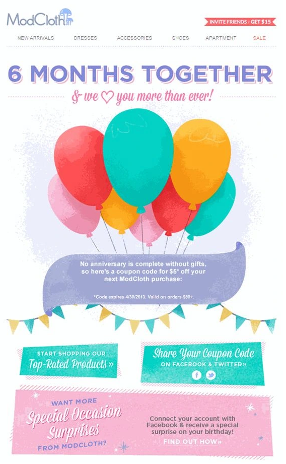 I liked this example from clothing retailer Modcloth, which is personalized to coincide with the customer’s anniversary of buying from the company: