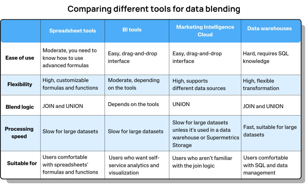 You can use several tools to perform the blend, including spreadsheets, BI tools, data warehouse, and the Supermetrics Marketing Intelligence Cloud. In a spreadsheet tool like Google Sheets, you can use different functions to blend data, including VLOOKUP, conditional aggregation, and IF + REGEXPMATCH. Looker Studio and the Supermetrics Intelligence Cloud have a click-and-drop interface, which makes it easier to establish and configure the blend. Meanwhile, you can blend in a data warehouse if you’re comfortable with SQL.