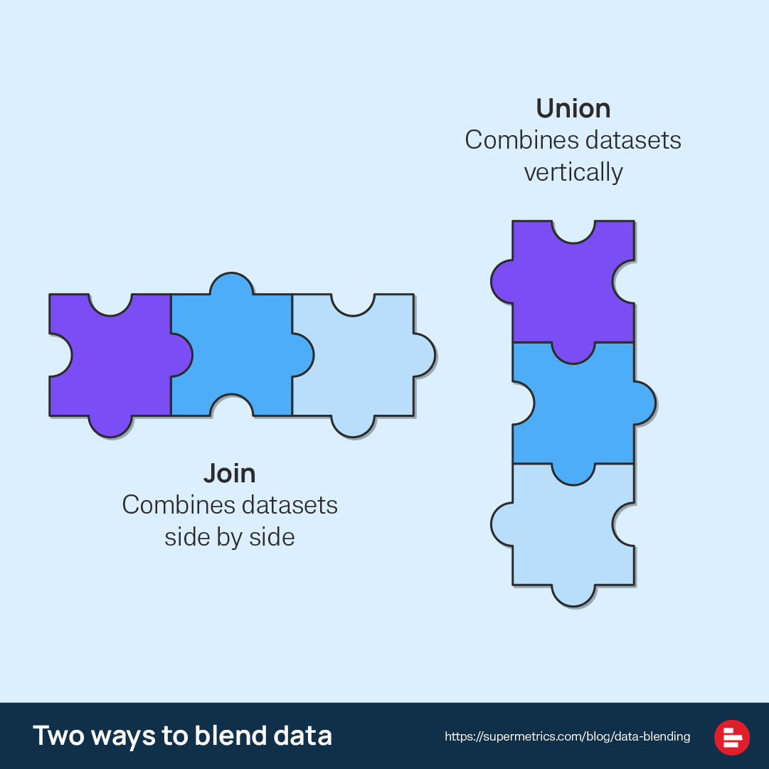 Essentially, there are two data blending techniques—UNION vs. JOIN. The main difference is how your data is combined.