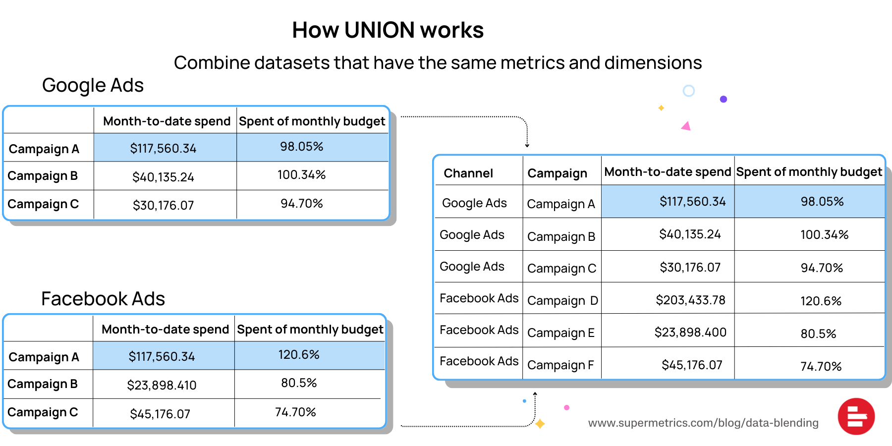 UNION is used when datasets have similar metrics and dimensions. The data tables are stacked on top of each other. It’s ideal for analyzing data from similar platforms. For example, for budget pacing, you’ll pull in the spend data from advertising platforms—they usually have similar metrics and dimensions—like Google Ads and Facebook Ads to see how your campaigns are pacing against an expected budget.