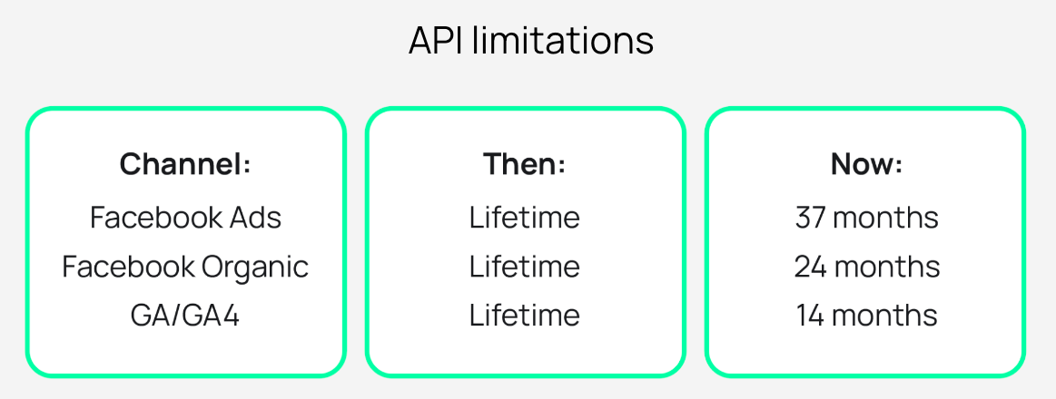 Many APIs have promised lifetime access to your data. But the rules changed, and while you still have access for 37 months to your Facebook Ads data , data retention for GA4 is only 14 months .