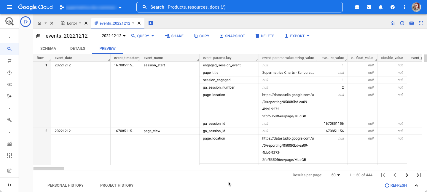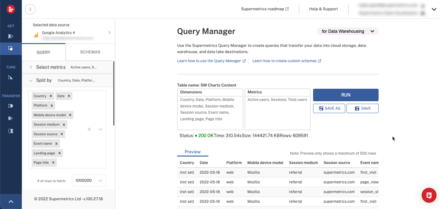 The Supermetrics warehouse connector makes things much easier. You can use the standard schema from Supermetrics to access your GA4 data without any preparation. You can also create your custom schema without writing a single line of code—everything is handled with a graphical UI.