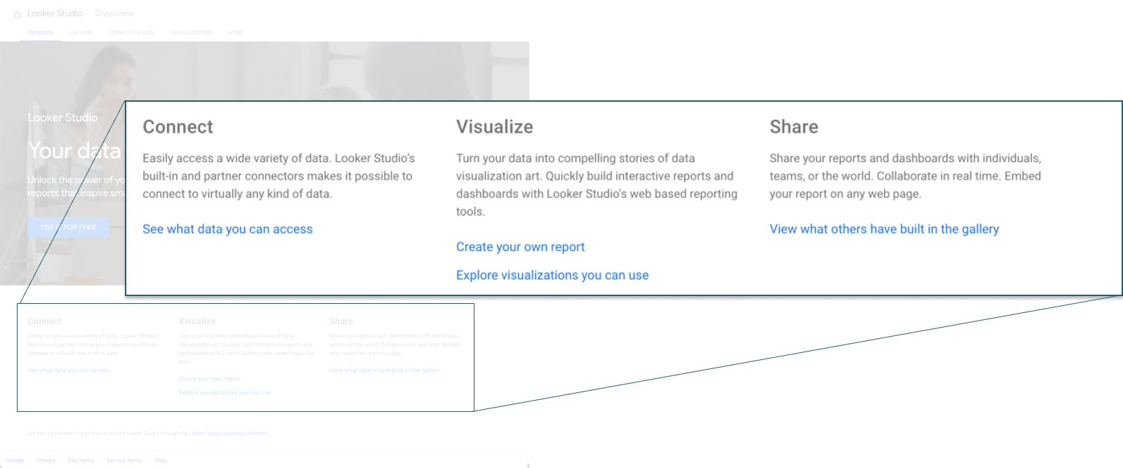 If you log out from Google and access the Looker Studio homepage , you’ll see the following product description.