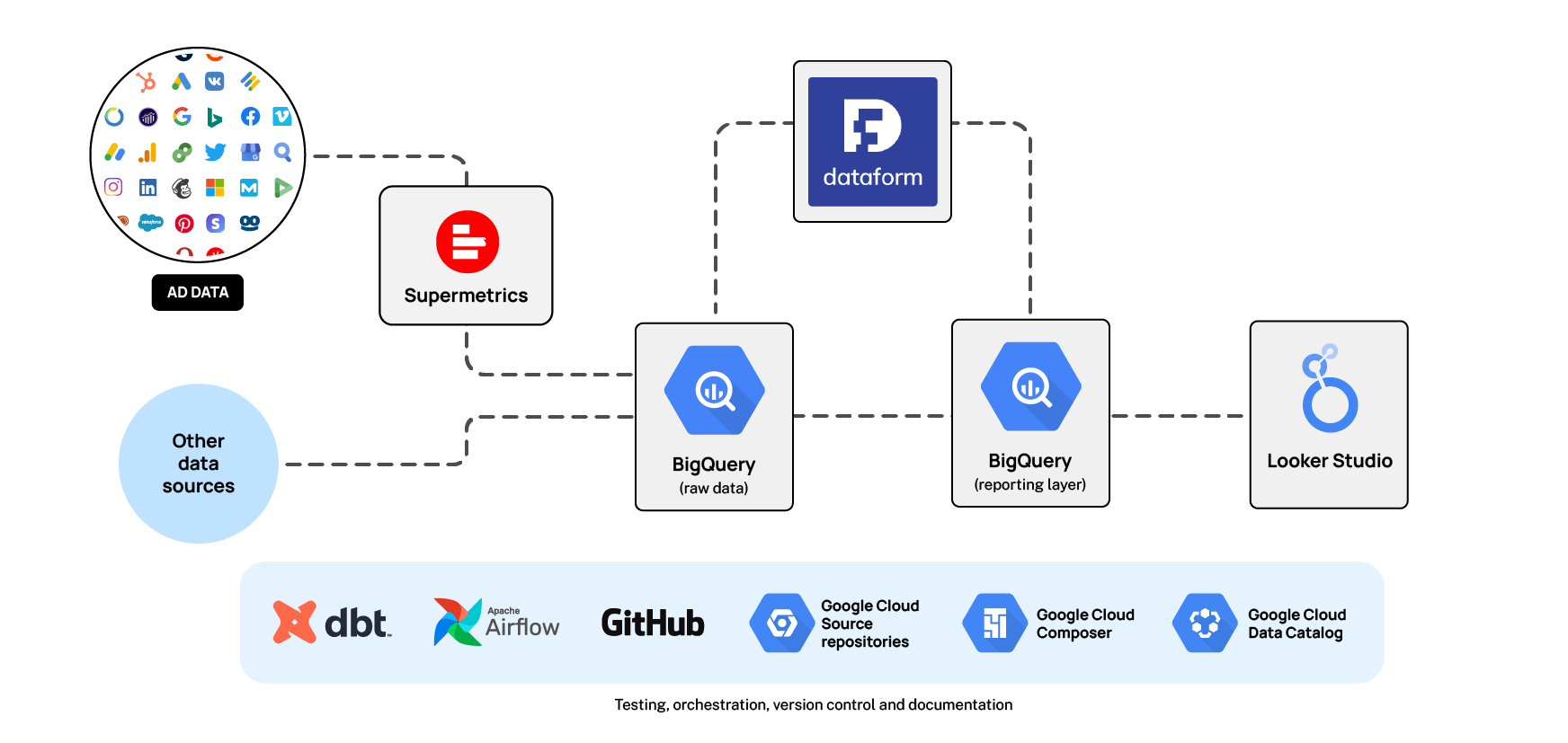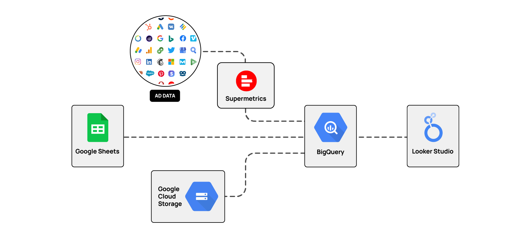 The basic marketing analytics stack is a good starting point when you graduate from your spreadsheet tool. You can use a data integration tool like Supermetrics to automate advertising data transfers into BigQuery. Additionally, you can add ad-hoc data sources, for example, your Google Sheets or Excel reports, as inputs to your data warehouse.
