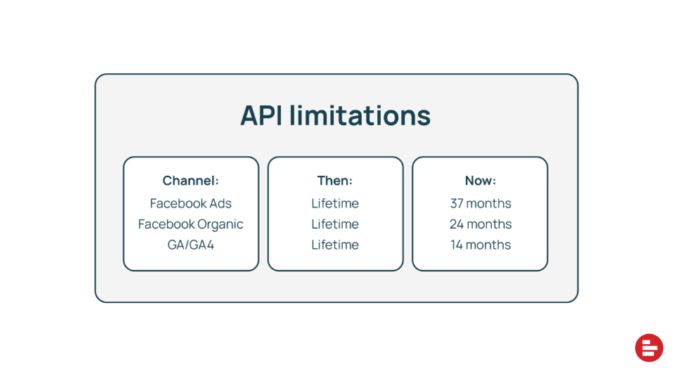 Most marketers rely on platforms like Google and Meta for their historical performance data. But any data left within a platform is vulnerable to data retention policy changes. The provider can alter how much data can be stored, how long it will be stored, and whether you can extract it.