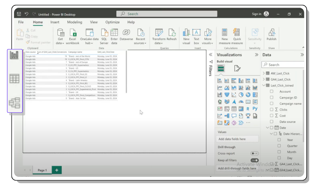 - Non-UNION data blending : Blending data horizontally (left, right, inner, outer) is something that Power BI handles very well. You can build and manage relationships using a point-and-click UI in the ‘Model’ view. This gives non-technical users the ability to draw insights from blended data. For example, you can do conversion attribution by blending GA4 data with ad spend data from Google Ads.