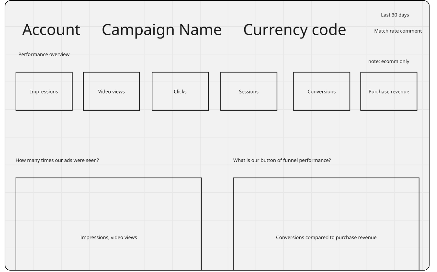 This step reinforces intentional information design and helps align visual output with business objectives. Similar to how writers do outlines, I like to plan my dashboard in Miro (you may use Canva or even paper). It’s literally boxes and labels, but it helps me build a map of where I’m trying to go, for example: