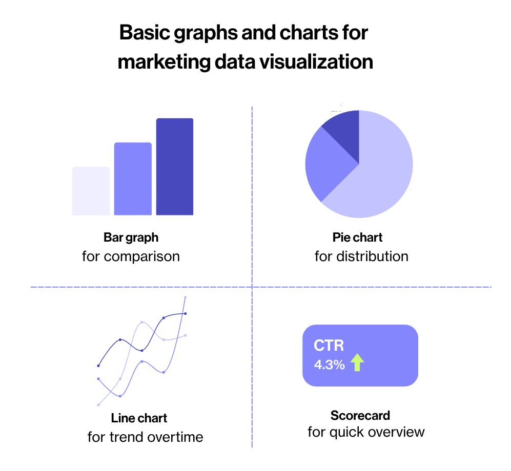 The effectiveness of your dashboard depends on the relevance and clarity of its visual elements. Most marketing questions can be answered using basic charts: