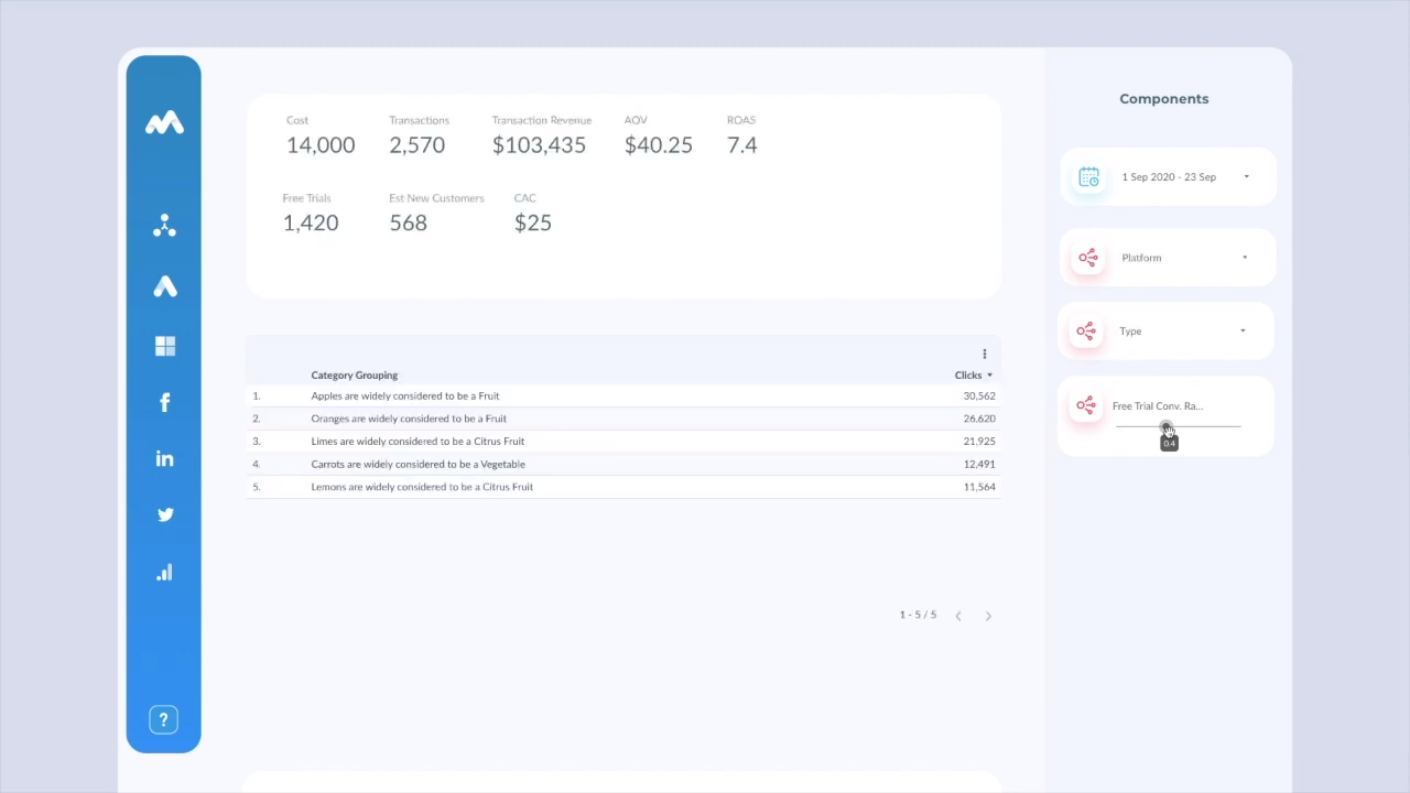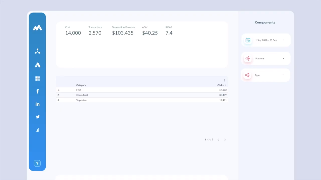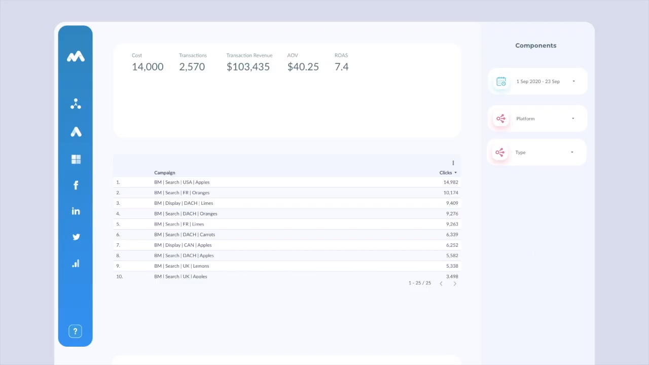 We’ve touched on aggregated ad platform metrics to your clicks, impressions, cost, and other metrics, all combined across the channels that you decide to plug in. Besides, you have the option of platform and analytics conversions. If you pull goal and ecommerce metrics from Google Analytics, you can compare them to your platform data.