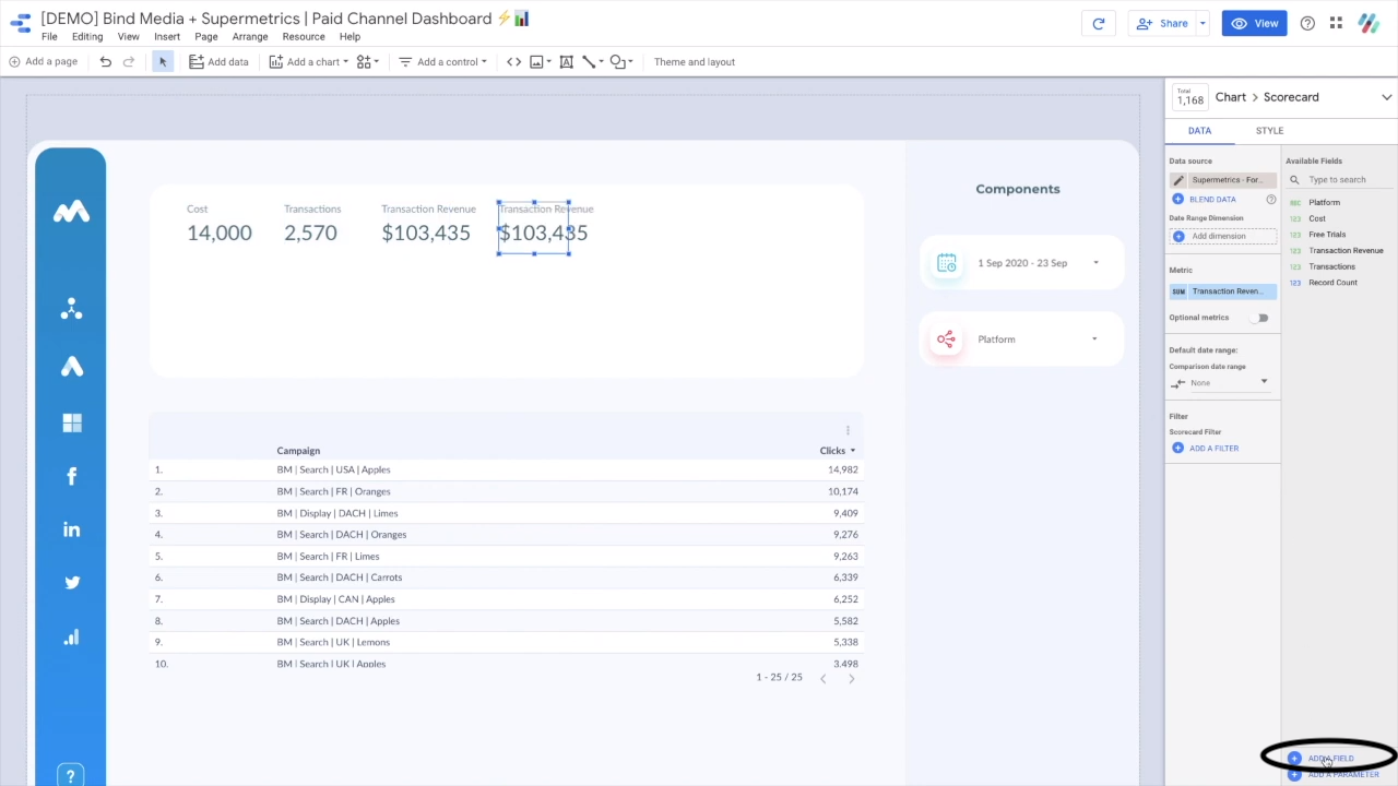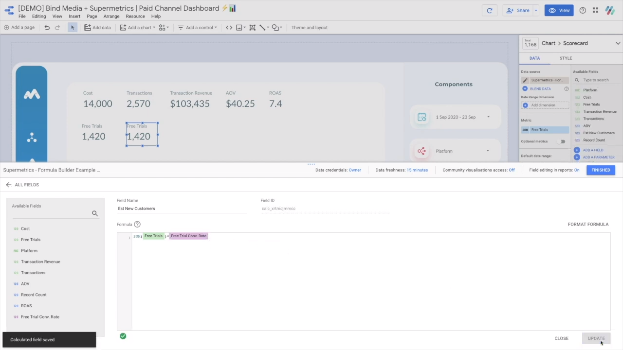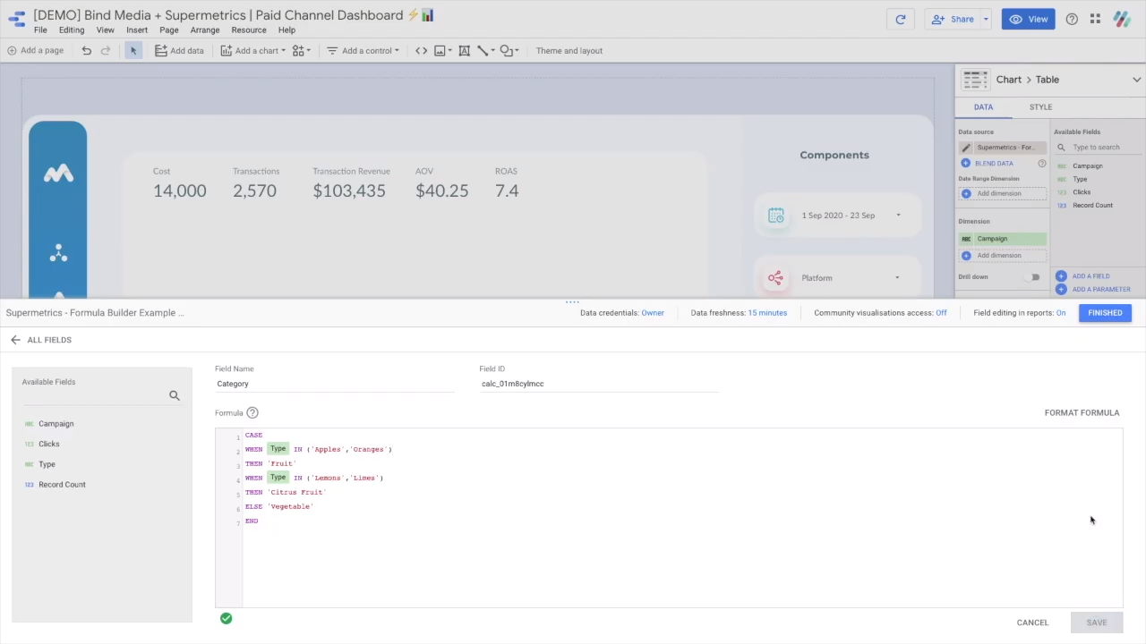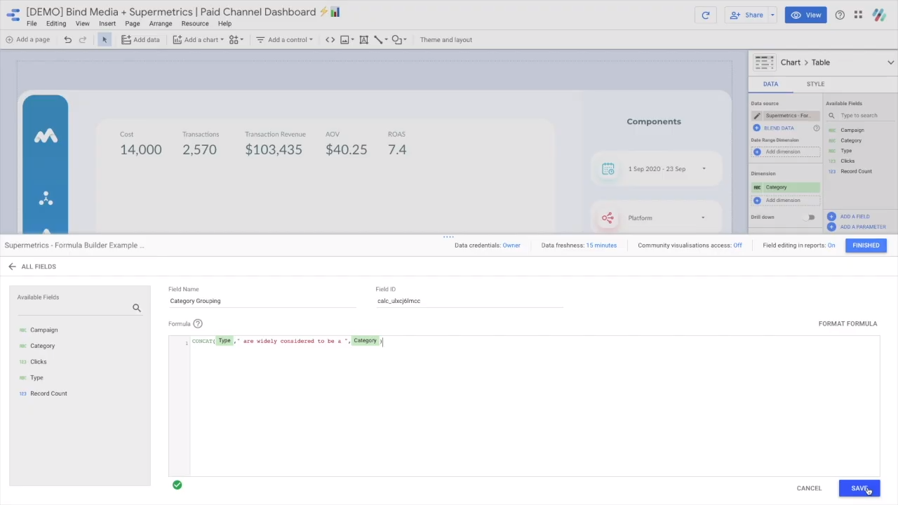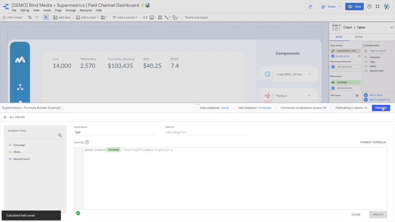 After you’ve copied the formula, go back to Google Data Studio and add it as a custom field. The regex we’ve placed will extract the correct value from the campaign name.