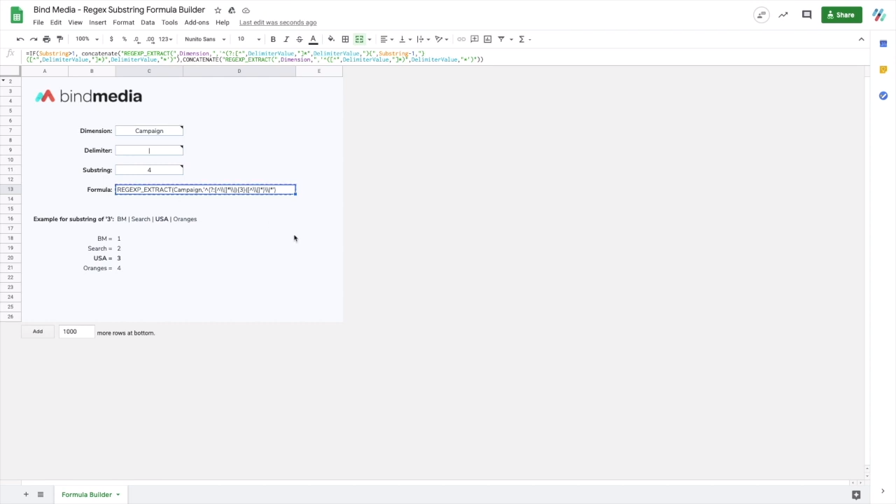 For this example, we’ll use the Google Sheets tool we created. This tool helps extract the parameters from the campaign dimension, which is comparable across all ad platforms. The vertical bar here is a mark that separates the campaign name parts.
