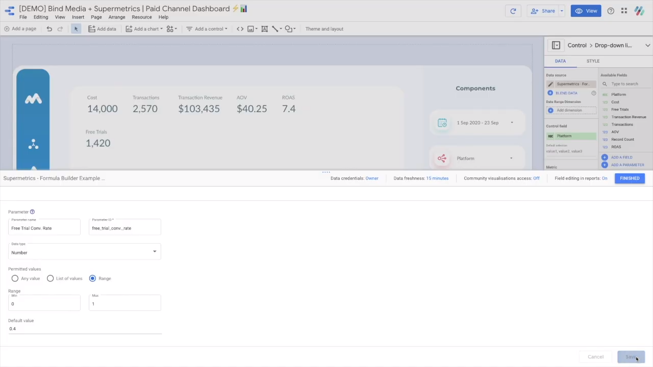 With a couple of calculated metrics, this parameter, and a slider, we can then see how the metrics will change. It’s great for doing some scenario planning and modeling. For example, you could input budgets for the new campaigns and see how many new customers you want to get.
