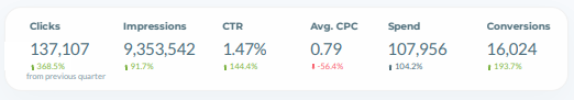Like with the overview page, the scorecards at the top show the changes in clicks, impressions, CTR, average CPC, spend, and conversions.
