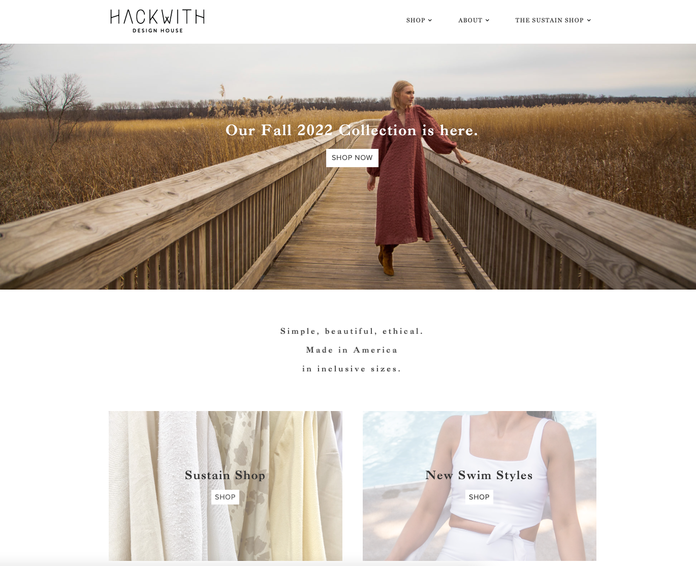 Take, for example, the homepage of Hackwith Design House . The first thing you see is a large image that aligns with the message about the brand’s commitment to making versatile and sustainable clothing. The CTA is clear and strategically placed, so that site visitors don’t miss it.