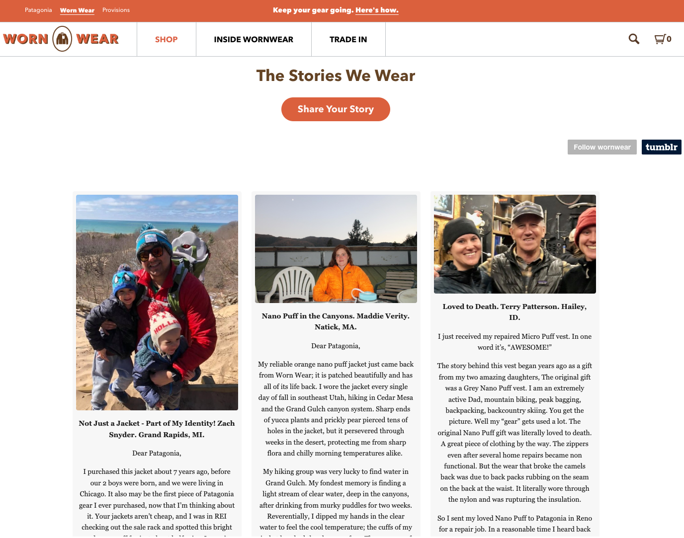 An example of a brand using this CRO strategy is Patagonia. The brand has a “ Worn to Wear Stories ” page highlighting its customers’ experiences with Patagonia products. The page shows how much customers love the brand and how its gear can withstand extreme adventures.