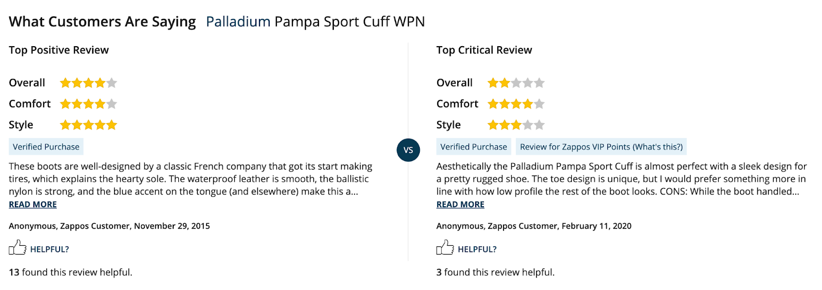 Zappos shows customer ratings for each product at the top of the image. It’s one of the first things users see on each product page. And you can read full reviews by clicking on the rating.