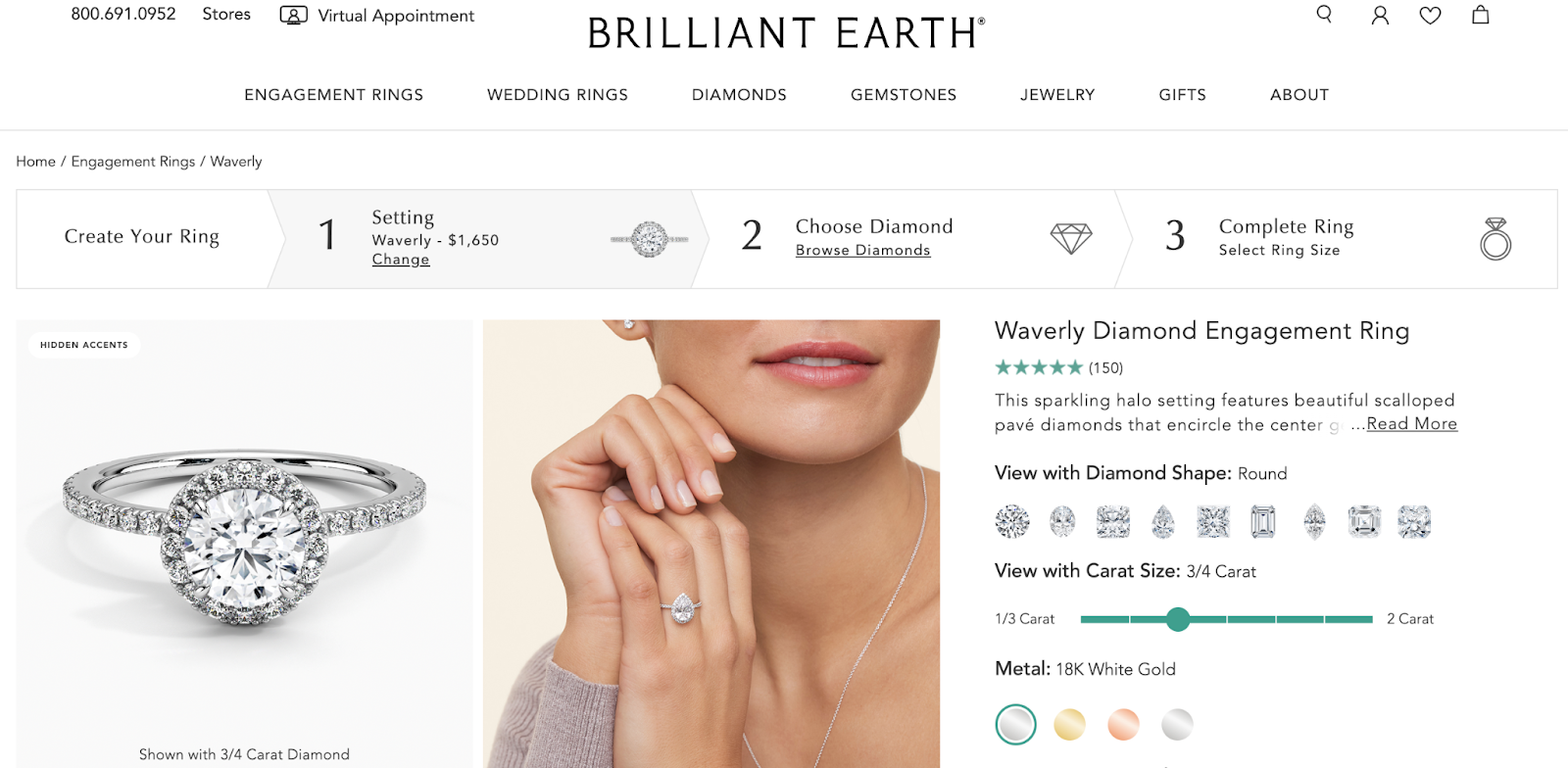 California-based jewelry company Brilliant Earth has used beautiful images for all of its jewelry. What’s more, they also have an interactive video option. Using this feature, users can rotate the picture to get a better view of the jewelry from different angles.