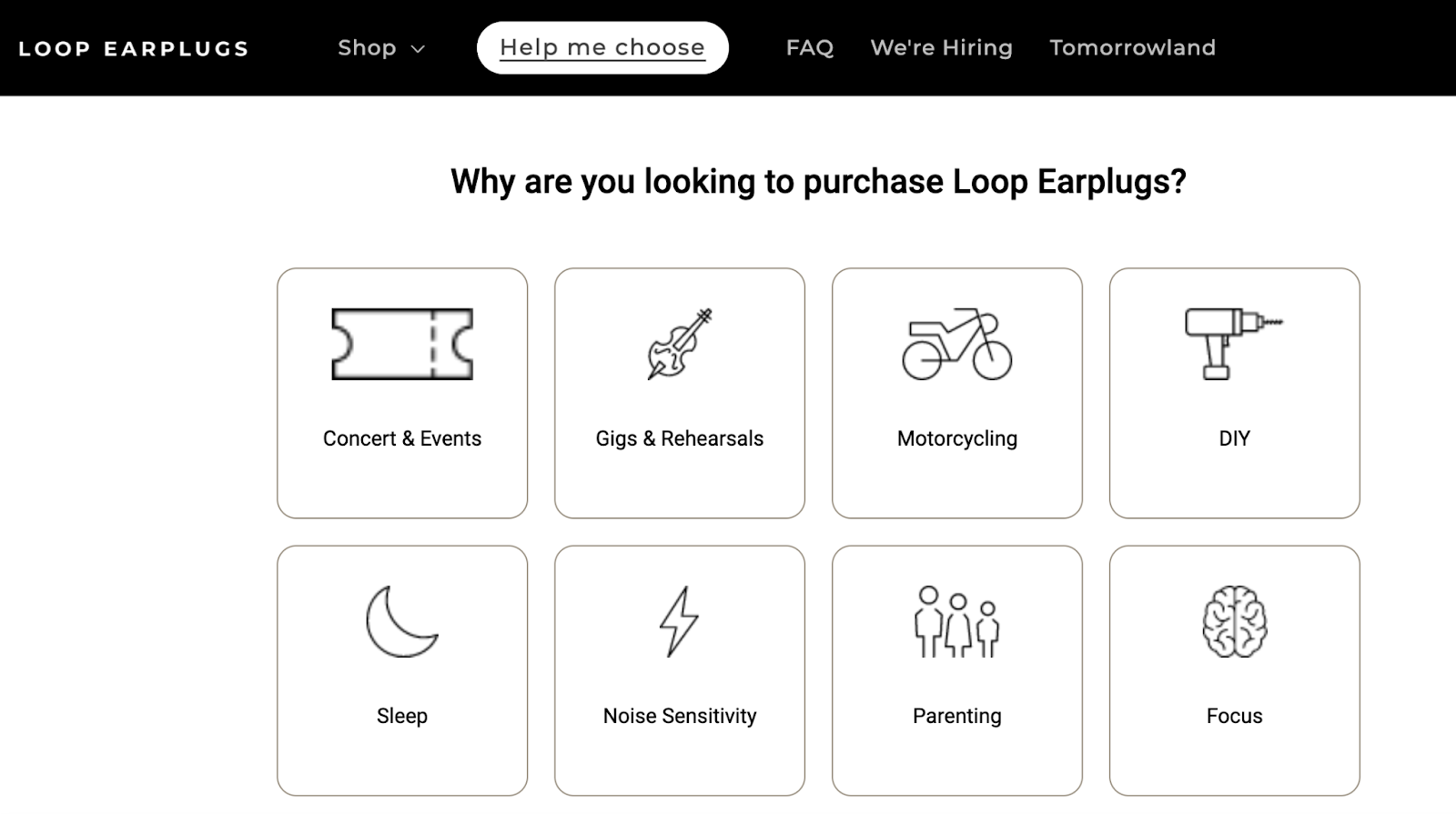 Loop Earplugs adds a quiz to their website to help their store visitors choose the best product for their needs. Customers will answer questions such as: