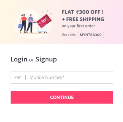 Myntra’s signup page entices new users with free shipping and a discount on their first order.