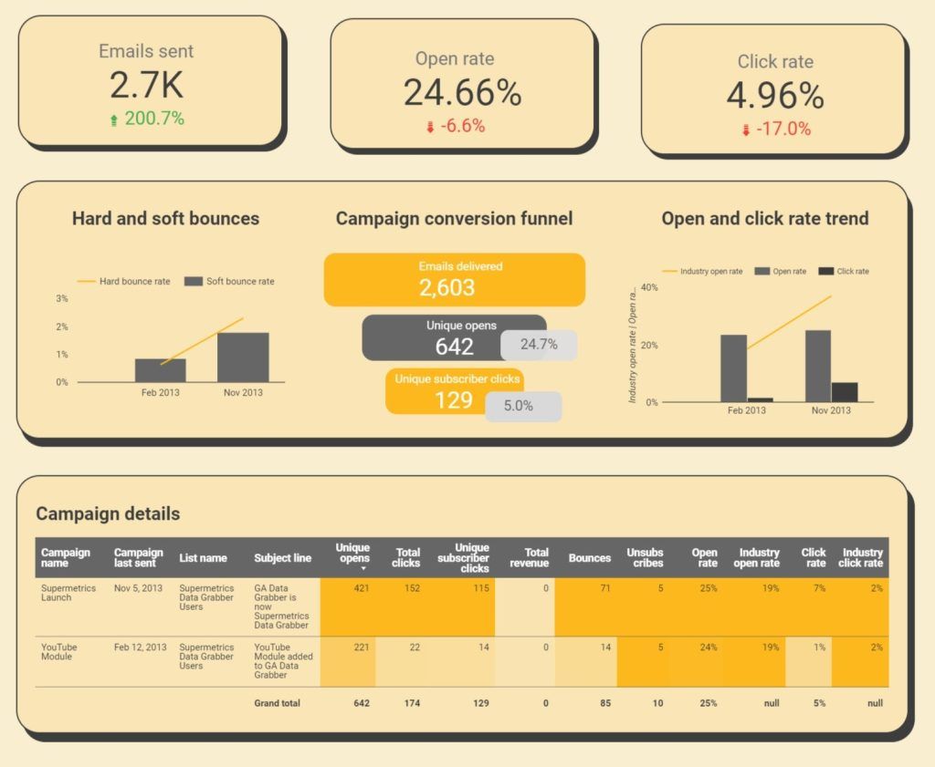 First, focus on the top three categories of metrics that answer the essential question: what’s the purpose of your dashboard? After selecting the top three, you can continue by adding additional information that can help you improve your email marketing game in the future.