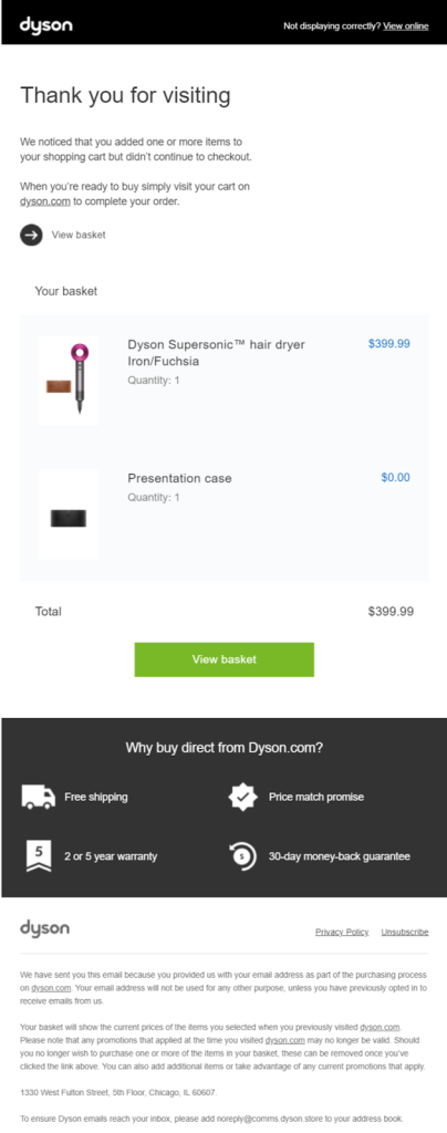 Dyson sends a series of abandoned cart emails to follow up with the customers and remind them to proceed with the purchase. Besides showing the items that the customer added to the cart, they also highlight all the benefits for buying directly from their site, such as free shipping, 30-day money-back guarantee, product warranty, and price match promise.