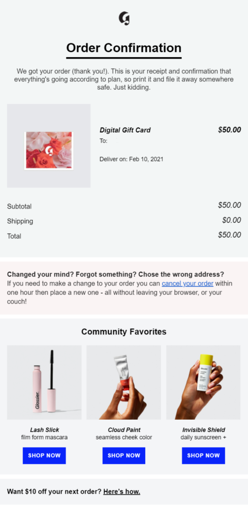 Glossier uses order confirmation emails to check with customers whether they changed their mind or chose the wrong address and gives them a chance to change or cancel the order within one hour. Besides this, they have a recommendation section with some of the most popular products.