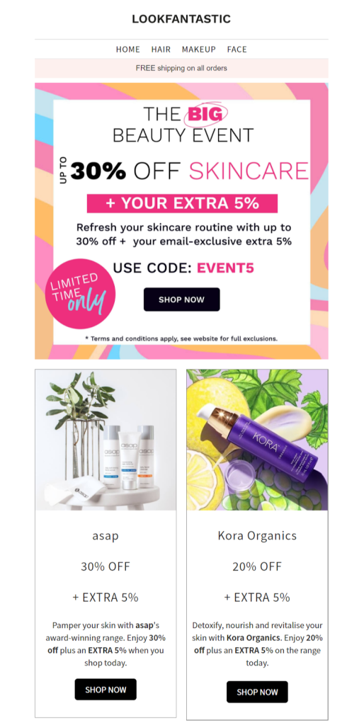 Lookfantastic uses limited-time discounts to stimulate email subscribers to take action and make a purchase. Besides the standard discount, they give the extra 5% discount for email subscribers and remind them about the free shipping. The recommendation section with selected products can only spark customers’ desire to click the “Shop now” button before the offer expires.
